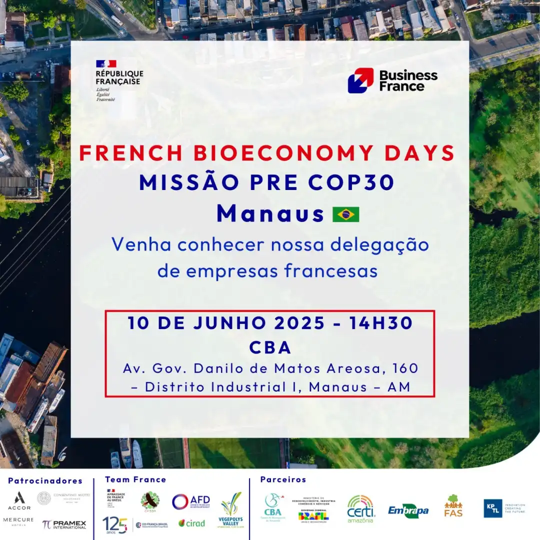 O evento “French Bioeconomy Days” reunirá em Manaus uma delegação de empresas francesas ligadas à bioeconomia. A iniciativa faz parte da preparação para a COP30, que acontecerá em 2025 em Belém (PA). O encontro será uma oportunidade para troca de experiências, parcerias e inovação sustentável.
