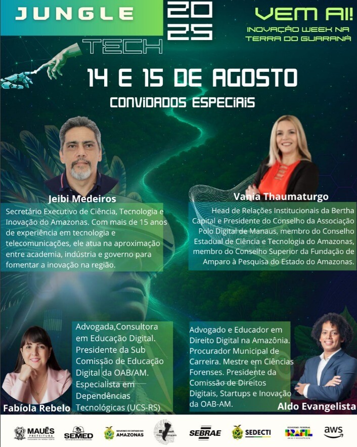 Nos dias 14 e 15 de agosto de 2025, Maués, conhecida como a Terra do Guaraná, se transforma em um polo de inovação e tecnologia com a realização do Jungle Tech – Inovation Week. O evento acontece no Centro Educacional de Tecnologia e Robótica da cidade e é voltado a todos que desejam impulsionar o desenvolvimento da Amazônia por meio da ciência, tecnologia e empreendedorismo.