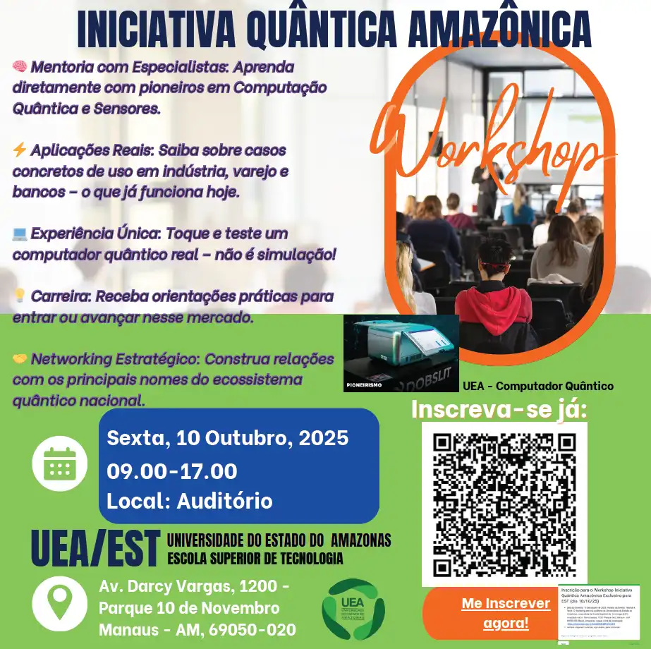 A Universidade do Estado do Amazonas (UEA), por meio da Escola Superior de Tecnologia (UEA-EST), realiza no dia 10 de outubro de 2025, o Workshop Iniciativa Quântica Amazônica, um evento que une teoria, prática e networking em torno da Computação Quântica e Sensores Inteligentes.